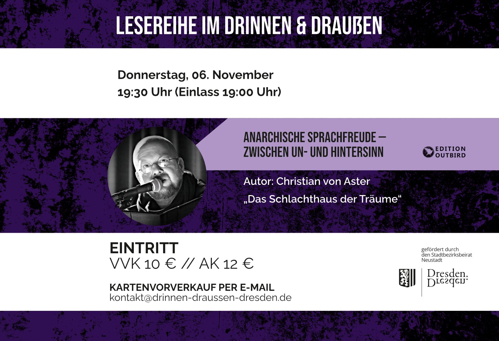 ![]() Einlass 19:00 Uhr | pünktlicher Start 19:30 Uhr Eintritt: VVK 10,00 € | AK 12,00 € Achtung – es gibt nur 30 Plätze! Vorverkauf per E-Mail. Wenn Ihr Karten kaufen wollt, schreibt uns an: kontakt@drinnen-draussen-dresden.de Über den Autor Der Satiriker, Grabredner und Märchenerzähler Christian von Aster stellt seinen Gedichtband „Das Schlachthaus der Träume“ vor. Mit schier […] |
