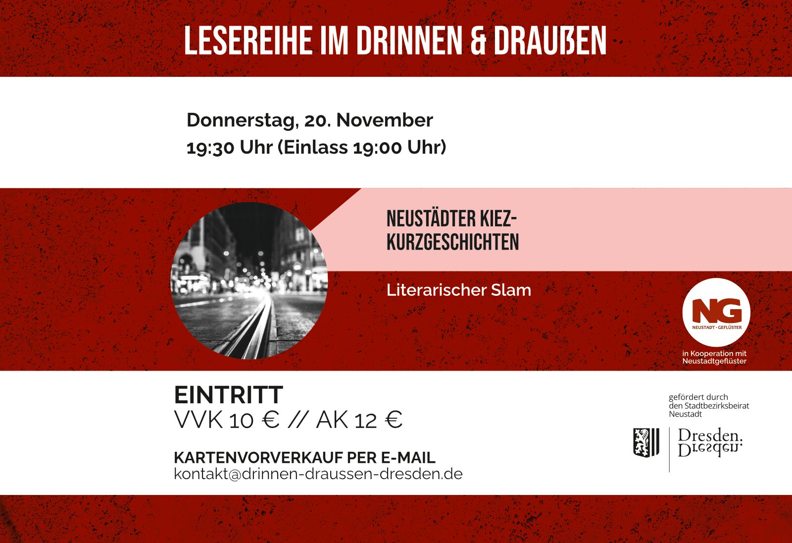 ![]() Einlass 19:00 Uhr | pünktlicher Start 19:30 Uhr Eintritt: VVK 10,00 € | AK 12,00 € Achtung – es gibt nur 30 Plätze! Vorverkauf per E-Mail. Wenn Ihr Karten kaufen wollt, schreibt uns an: kontakt@drinnen-draussen-dresden.de Über die Veranstaltung Neustädter Kiez–Kurzgeschichten: Literarischer Slam im Drinnen & Draußen Am 20. November 2025 verwandelt sich das Drinnen & Draußen […] |